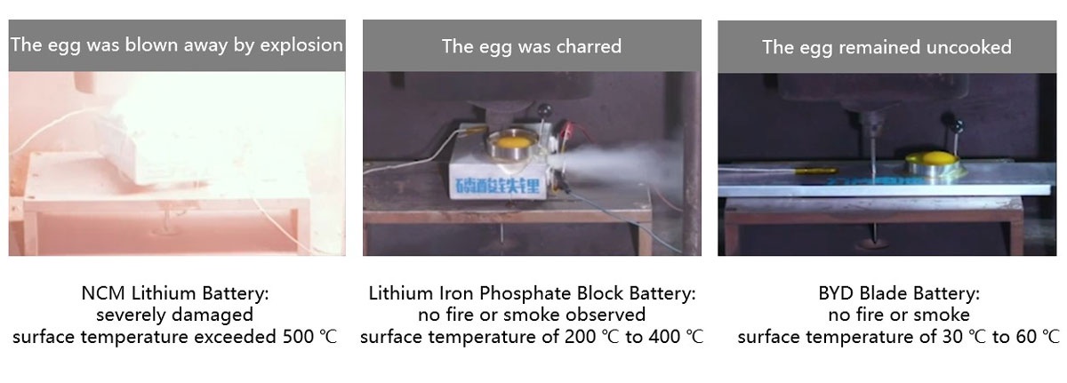 Test results for three types of EV power batteries after nail penetration, with eggs used to indicate the temperature on the battery’s surface