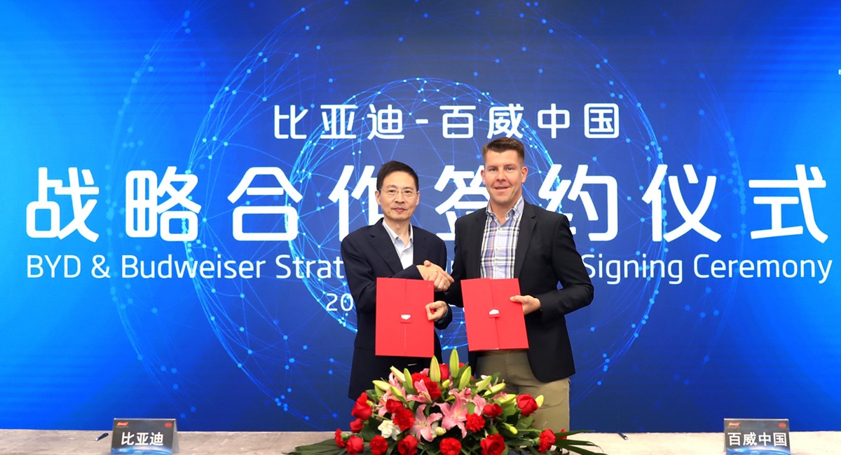 Shenzhen, China - On April 13th, BYD and Budweiser China signed a strategic cooperation agreement at the BYD global headquarters in Shenzhen. Budweiser China will take the lead by purchasing BYD Q3 heavy-duty electric trucks according to the agreement, and will deploy these trucks in its breweries in Foshan, Tangshan, Wuhan, and other cities separately.